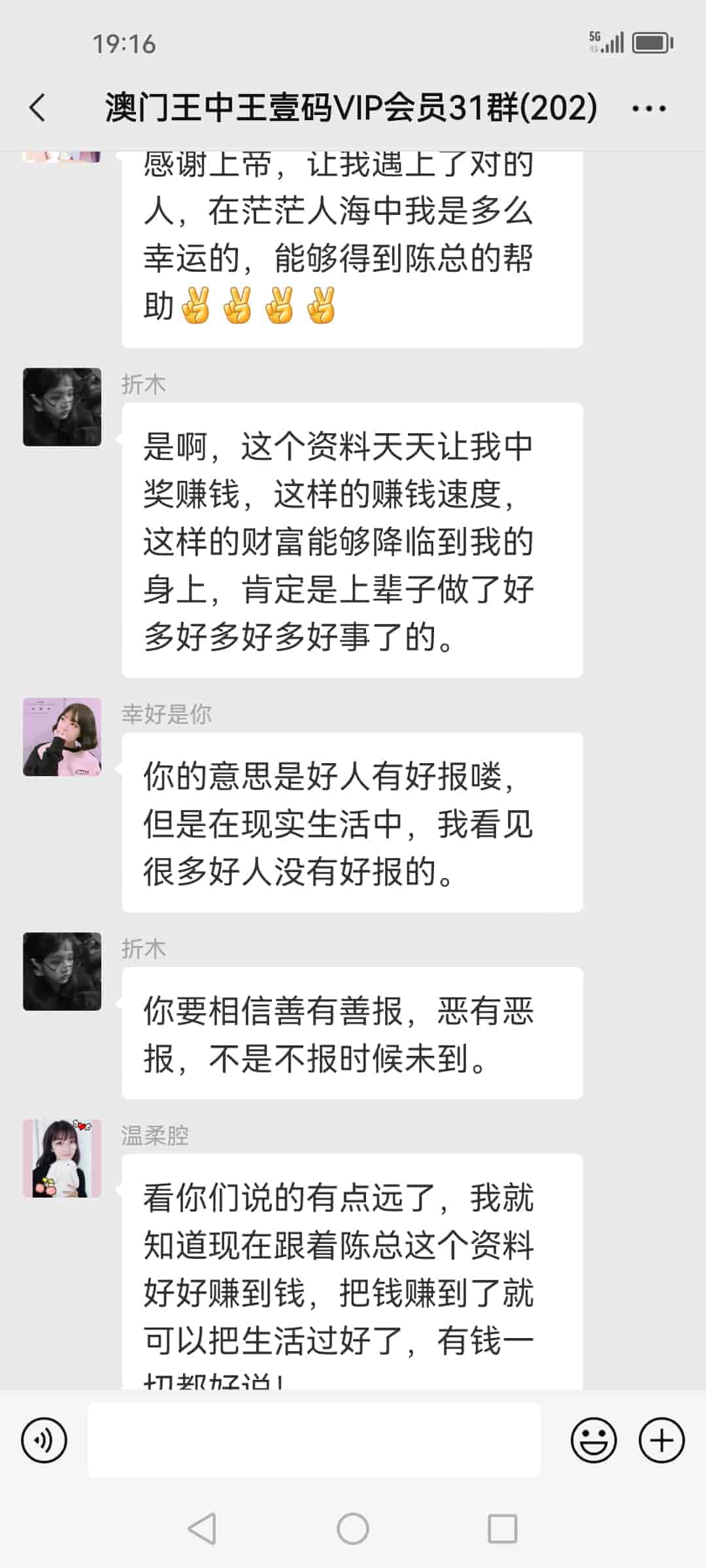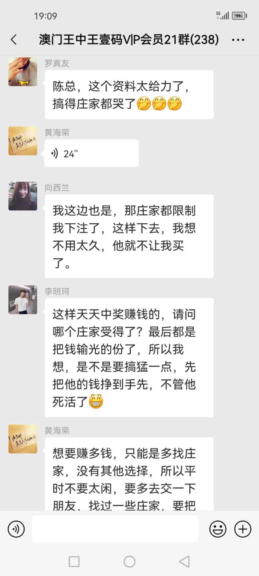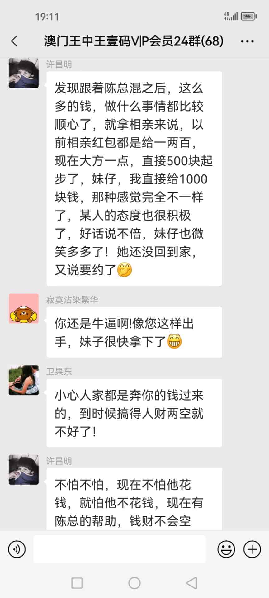 发表于51天前 陈总好,我姓欧阳,我刚刚通过扫一扫加了你的微信,也已经转了798块合作费过去给你了,我是真心诚意跟你合作的,我玩六合彩已经7.8年了,都是输的多,几乎把所有的工资都输光了,老家还欠朋友一屁股债,请陈总你帮帮我,我做人懂得知恩图报,到时候我也一定给你红包的,合作愉快。 |